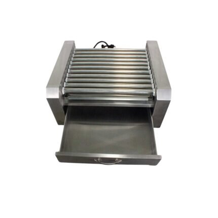 Máquina de Hotdogs con 11 rodillos y recipiente de grasa. Rodillos (201) y cuerpo (430) en acero inox. Potencia de 1350w. Diámetro de rodillo: 25 mm Medidas: 58 cm x 50.5 cm x 18 cm Tapa de de cristal se vende por separado