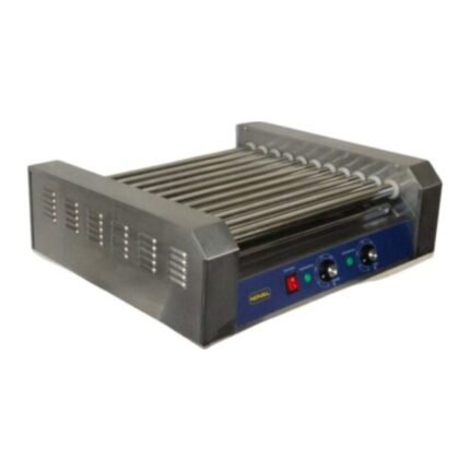 Máquina de Hotdogs con gabinete para PAN con capacidad de 9.5lt. 11 rodillos y recipiente de grasa. Rodillos (201) y cuerpo (430) en acero inox. Potencia de 1650w. Diámetro de rodillo: 25 mm Medidas: 59 cmx48.5cmx30cm. Tapa de de cristal se vende por separado
